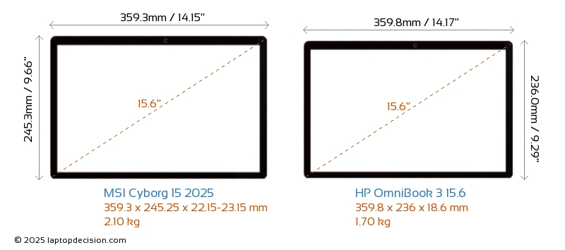 USBBeide Cyborg 15 2025 und OmniBook 3 15.6 verfügen über 2x USB 3.2 USB-A-Ports.Beide Cyborg 15 2025 und OmniBook 3 15.6 verfügen über 1x USB 3.2 USB-Type-C-Ports.