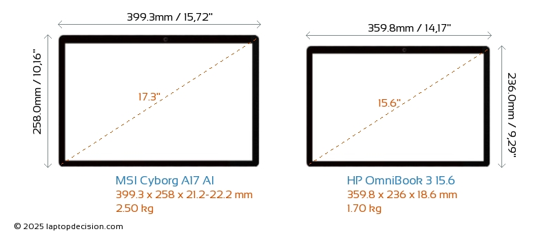 USBBeide Cyborg A17 AI und OmniBook 3 15.6 verfügen über 2x USB 3.2 USB-A-Ports.Beide Cyborg A17 AI und OmniBook 3 15.6 verfügen über 1x USB 3.2 USB-Type-C-Ports.