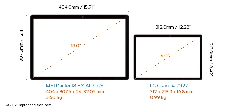 HDMIBeide, Raider 18 HX AI 2025 und Gram 14 2022, verfügen über einen HDMI-Port. Raider 18 HX AI 2025 bietet 1x HDMI 2.1, während Gram 14 2022 1x HDMI 2.0 bietet.