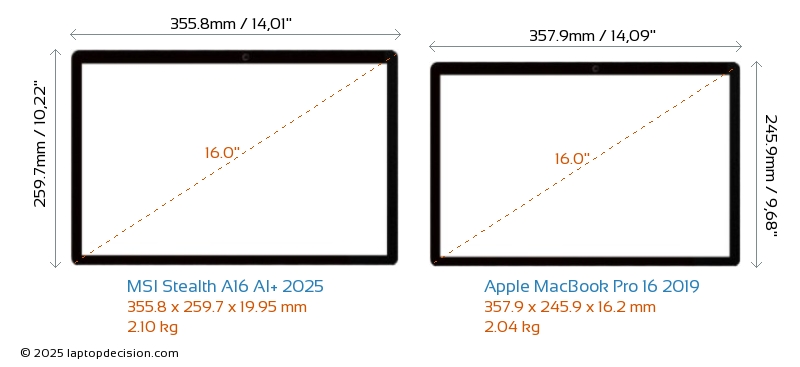 HDMI Stealth A16 AI+ 2025 verfügt über einen HDMI-Port (1x HDMI 2.1) zum Anschluss an externe Monitore. MacBook Pro 16 2019 hat keinen HDMI-Port.