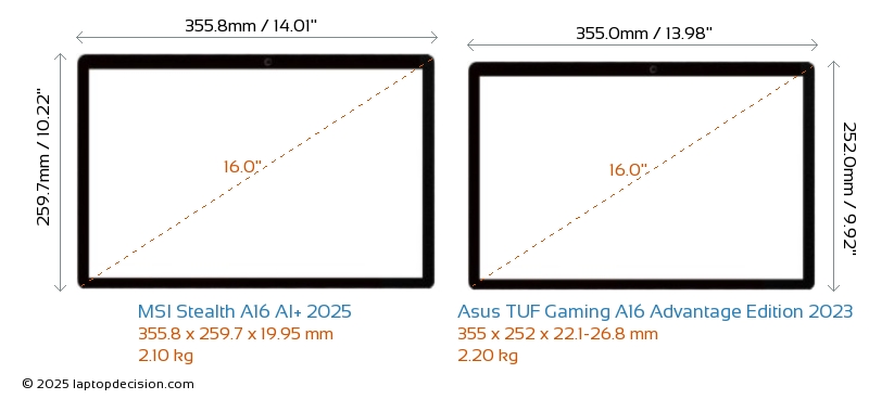USBBeide Stealth A16 AI+ 2025 und TUF Gaming A16 Advantage Edition 2023 verfügen über 2x USB 3.2 USB-A-Ports.Beide Stealth A16 AI+ 2025 und TUF Gaming A16 Advantage Edition 2023 haben USB-Type-C-Ports. Stealth A16 AI+ 2025 hat 1x USB 4.0 USB Type-C-Ports, während TUF Gaming A16 Advantage Edition 2023 2x USB 3.2 USB Type-C-Ports hat.