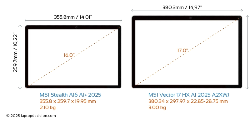ThunderboltBeide, Stealth A16 AI+ 2025 und Vector 17 HX AI 2025 A2XWJ, verfügen über Thunderbolt-Ports. Stealth A16 AI+ 2025 hat Thunderbolt 4, während Vector 17 HX AI 2025 A2XWJ Thunderbolt 5 hat.