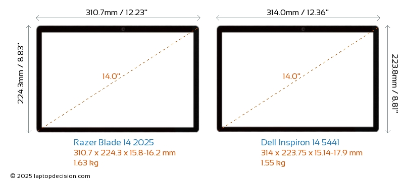 HDMI Blade 14 2025 verfügt über einen HDMI-Port (1x HDMI 2.1) zum Anschluss an externe Monitore. Inspiron 14 5441 hat keinen HDMI-Port.