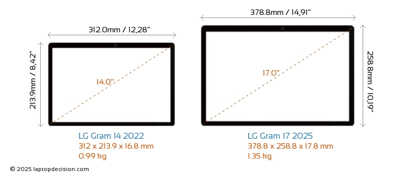 HDMIAmbos Gram 14 2022 y Gram 17 2025 cuentan con un puerto HDMI. Gram 14 2022 ofrece 1x HDMI 2.0, mientras que Gram 17 2025 ofrece 1x HDMI 2.1.