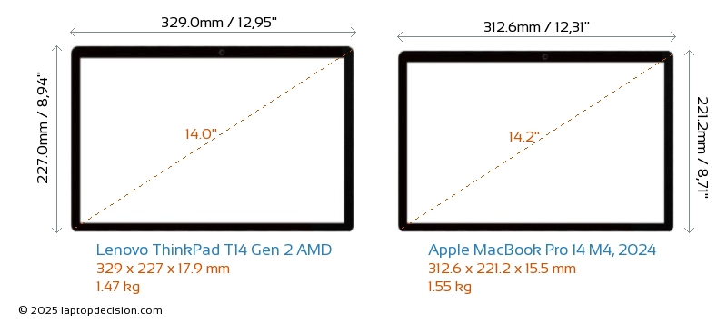 Thunderbolt MacBook Pro 14 M4, 2024 está equipado con un puerto Thunderbolt 4. ThinkPad T14 Gen 2 AMD no tiene puerto Thunderbolt.