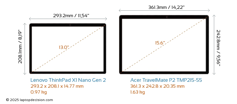 HDMI TravelMate P2 TMP215-55 cuenta con un puerto HDMI (1x HDMI 2.1) para conectar a monitores externos. ThinkPad X1 Nano Gen 2 no tiene puerto HDMI.