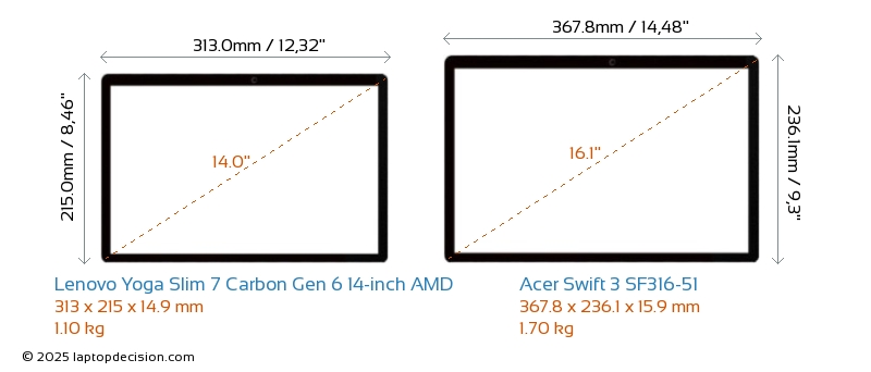 HDMISwift 3 SF316-51 cuenta con un puerto HDMI (1x HDMI 2.0) para conectar a monitores externos. Yoga Slim 7 Carbon Gen 6 14-inch AMD no tiene puerto HDMI.