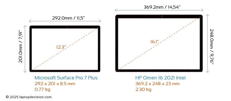 HDMI Omen 16 2021 Intel cuenta con un puerto HDMI (1x HDMI 2.1) para conectar a monitores externos. Surface Pro 7 Plus no tiene puerto HDMI.