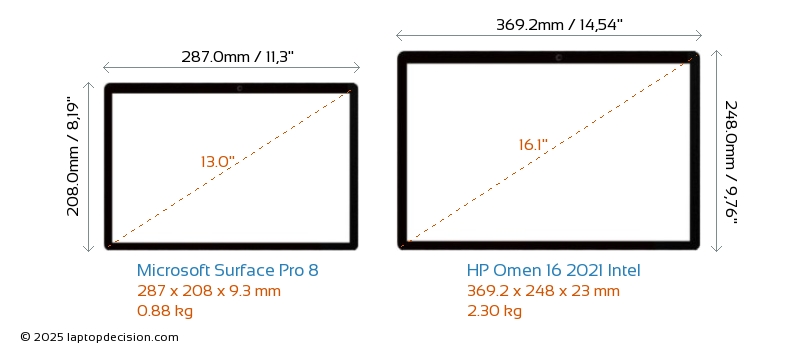 HDMI Omen 16 2021 Intel cuenta con un puerto HDMI (1x HDMI 2.1) para conectar a monitores externos. Surface Pro 8 no tiene puerto HDMI.