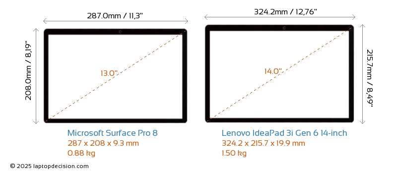 ThunderboltSurface Pro 8 está equipado con un puerto Thunderbolt 4. IdeaPad 3i Gen 6 14-inch no tiene puerto Thunderbolt.