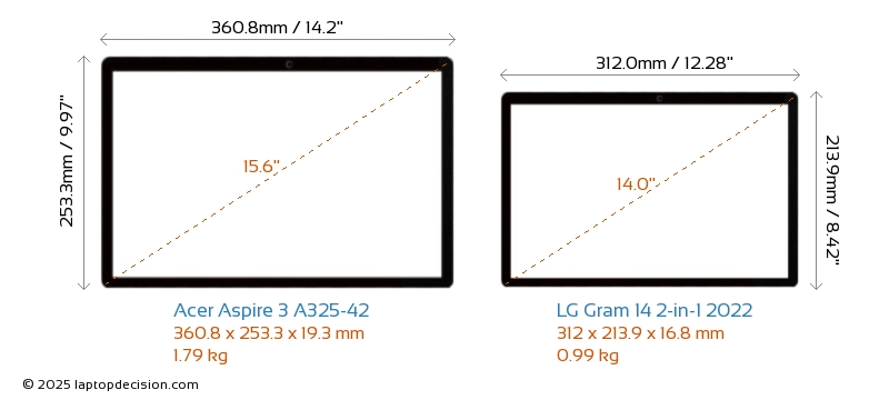 HDMIAmbos Aspire 3 A325-42 y Gram 14 2-in-1 2022 cuentan con un puerto HDMI. Aspire 3 A325-42 ofrece 1x HDMI 1.4, mientras que Gram 14 2-in-1 2022 ofrece 1x HDMI 2.0.