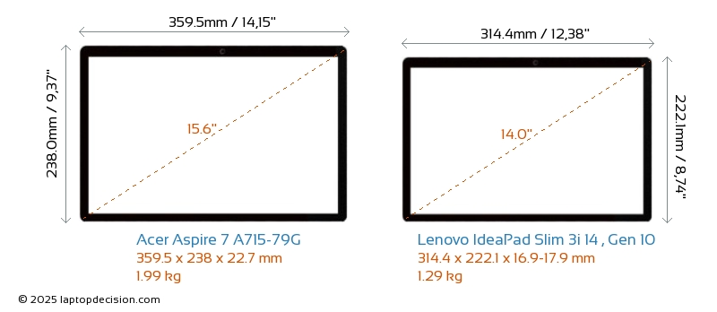 USBAmbos Aspire 7 A715-79G y IdeaPad Slim 3i 14 , Gen 10 cuentan con 2x USB 3.2 puertos USB-A.Ambos Aspire 7 A715-79G y IdeaPad Slim 3i 14 , Gen 10 tienen puertos USB Type-C. Aspire 7 A715-79G tiene 2x USB 3.2 puertos USB Type-C, mientras que IdeaPad Slim 3i 14 , Gen 10 tiene 1x USB 3.2 puertos USB Type-C.