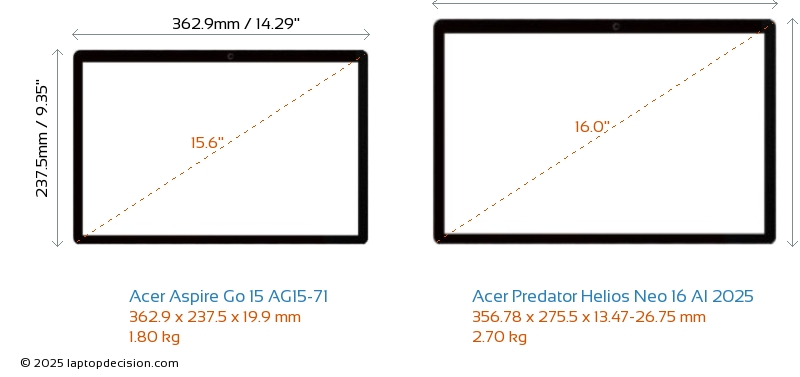 USBAmbos Aspire Go 15 AG15-71 y Predator Helios Neo 16 AI 2025 tienen puertos USB-A. Aspire Go 15 AG15-71 tiene 2x USB 3.2 puertos USB-A, mientras que Predator Helios Neo 16 AI 2025 tiene 3x USB 3.2 puertos USB-A.Ambos Aspire Go 15 AG15-71 y Predator Helios Neo 16 AI 2025 tienen puertos USB Type-C. Aspire Go 15 AG15-71 tiene 2x USB 3.2 puertos USB Type-C, mientras que Predator Helios Neo 16 AI 2025 tiene 2x USB 4.0 puertos USB Type-C.
