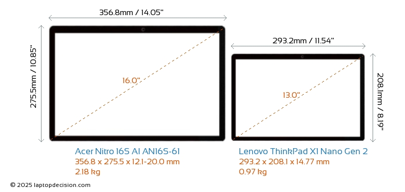 HDMI Nitro 16S AI AN16S-61 cuenta con un puerto HDMI (1x HDMI 2.1) para conectar a monitores externos. ThinkPad X1 Nano Gen 2 no tiene puerto HDMI.