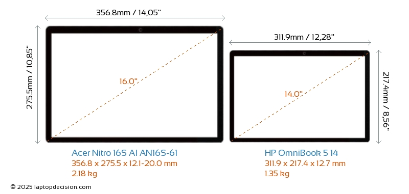 HDMI Nitro 16S AI AN16S-61 cuenta con un puerto HDMI (1x HDMI 2.1) para conectar a monitores externos. OmniBook 5 14 no tiene puerto HDMI.