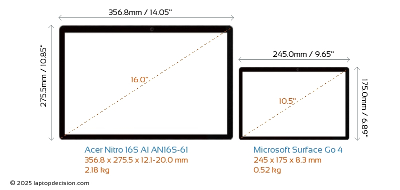 HDMI Nitro 16S AI AN16S-61 cuenta con un puerto HDMI (1x HDMI 2.1) para conectar a monitores externos. Surface Go 4 no tiene puerto HDMI.