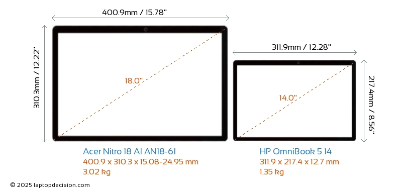 HDMI Nitro 18 AI AN18-61 cuenta con un puerto HDMI (1x HDMI 2.1) para conectar a monitores externos. OmniBook 5 14 no tiene puerto HDMI.