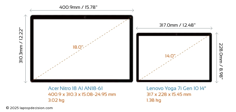 Wifi Yoga 7i Gen 10 14" cuenta con un estándar de Wi-Fi más avanzado v7, proporcionando conexiones inalámbricas más rápidas y fiables en comparación con Nitro 18 AI AN18-61 (v6E).
