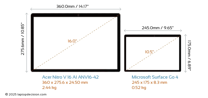 HDMI Nitro V 16 AI ANV16-42 cuenta con un puerto HDMI (1x HDMI 2.1) para conectar a monitores externos. Surface Go 4 no tiene puerto HDMI.