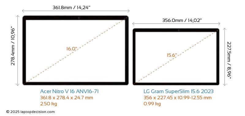 HDMI Nitro V 16 ANV16-71 cuenta con un puerto HDMI (1x HDMI 2.1) para conectar a monitores externos. Gram SuperSlim 15.6 2023 no tiene puerto HDMI.