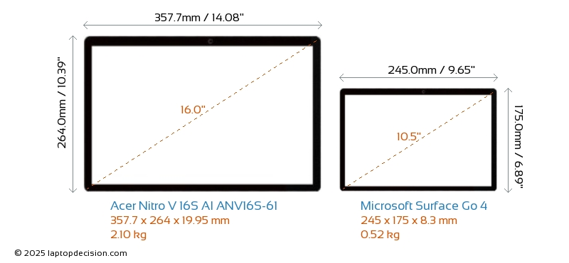 HDMI Nitro V 16S AI ANV16S-61 cuenta con un puerto HDMI (1x HDMI 2.1) para conectar a monitores externos. Surface Go 4 no tiene puerto HDMI.