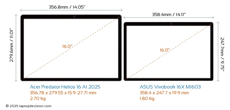 USBAmbos Predator Helios 16 AI 2025 y Vivobook 16X M1603 cuentan con 3x USB 3.2 puertos USB-A.Ambos Predator Helios 16 AI 2025 y Vivobook 16X M1603 tienen puertos USB Type-C. Predator Helios 16 AI 2025 tiene 2x USB 4.0 puertos USB Type-C, mientras que Vivobook 16X M1603 tiene 1x USB 3.2 puertos USB Type-C.