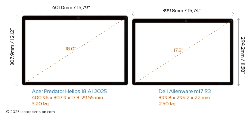 HDMIAmbos Predator Helios 18 AI 2025 y Alienware m17 R3 cuentan con un puerto HDMI. Predator Helios 18 AI 2025 ofrece 1x HDMI 2.1, mientras que Alienware m17 R3 ofrece 1x HDMI 2.0.