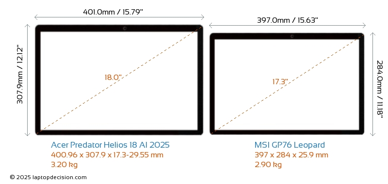 USBAmbos Predator Helios 18 AI 2025 y GP76 Leopard cuentan con 3x USB 3.2 puertos USB-A.Ambos Predator Helios 18 AI 2025 y GP76 Leopard tienen puertos USB Type-C. Predator Helios 18 AI 2025 tiene 2x USB 4.0 puertos USB Type-C, mientras que GP76 Leopard tiene 1x USB 3.2 puertos USB Type-C.