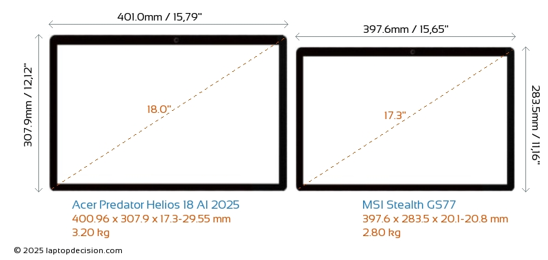 USBAmbos Predator Helios 18 AI 2025 y Stealth GS77 tienen puertos USB-A. Predator Helios 18 AI 2025 tiene 3x USB 3.2 puertos USB-A, mientras que Stealth GS77 tiene 2x USB 3.2 puertos USB-A.Ambos Predator Helios 18 AI 2025 y Stealth GS77 tienen puertos USB Type-C. Predator Helios 18 AI 2025 tiene 2x USB 4.0 puertos USB Type-C, mientras que Stealth GS77 tiene 1x USB 3.2 puertos USB Type-C.