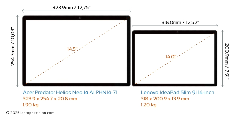 HDMI Predator Helios Neo 14 AI PHN14-71 cuenta con un puerto HDMI (1x HDMI 2.1) para conectar a monitores externos. IdeaPad Slim 9i 14-inch no tiene puerto HDMI.