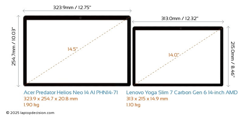 HDMI Predator Helios Neo 14 AI PHN14-71 cuenta con un puerto HDMI (1x HDMI 2.1) para conectar a monitores externos. Yoga Slim 7 Carbon Gen 6 14-inch AMD no tiene puerto HDMI.