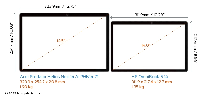 HDMI Predator Helios Neo 14 AI PHN14-71 cuenta con un puerto HDMI (1x HDMI 2.1) para conectar a monitores externos. OmniBook 5 14 no tiene puerto HDMI.