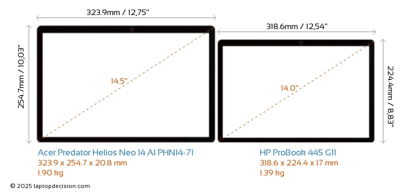 USBAmbos Predator Helios Neo 14 AI PHN14-71 y ProBook 445 G11 cuentan con 2x USB 3.2 puertos USB-A.Ambos Predator Helios Neo 14 AI PHN14-71 y ProBook 445 G11 cuentan con 2x USB 3.2 puertos USB Type-C.