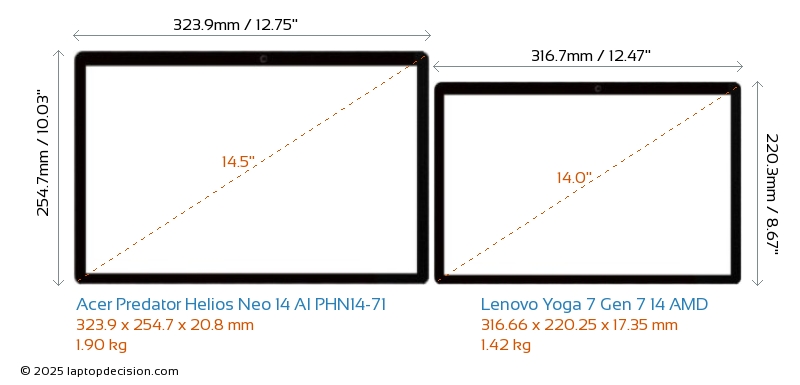 HDMIAmbos Predator Helios Neo 14 AI PHN14-71 y Yoga 7 Gen 7 14 AMD cuentan con un puerto HDMI. Predator Helios Neo 14 AI PHN14-71 ofrece 1x HDMI 2.1, mientras que Yoga 7 Gen 7 14 AMD ofrece 1x HDMI 2.0.
