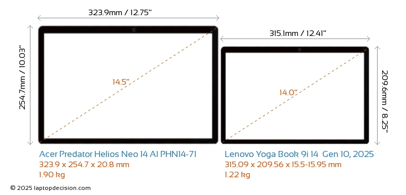 HDMI Predator Helios Neo 14 AI PHN14-71 cuenta con un puerto HDMI (1x HDMI 2.1) para conectar a monitores externos. Yoga Book 9i 14 Gen 10, 2025 no tiene puerto HDMI.