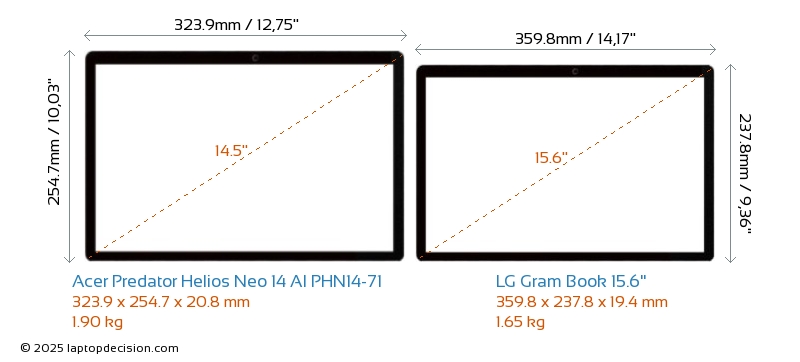 HDMIAmbos Predator Helios Neo 14 AI PHN14-71 y Gram Book 15.6" cuentan con un puerto HDMI. Predator Helios Neo 14 AI PHN14-71 ofrece 1x HDMI 2.1, mientras que Gram Book 15.6" ofrece 1x HDMI 1.4.