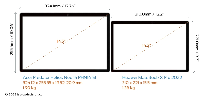 HDMI Predator Helios Neo 14 PHN14-51 cuenta con un puerto HDMI (1x HDMI 2.1) para conectar a monitores externos. MateBook X Pro 2022 no tiene puerto HDMI.