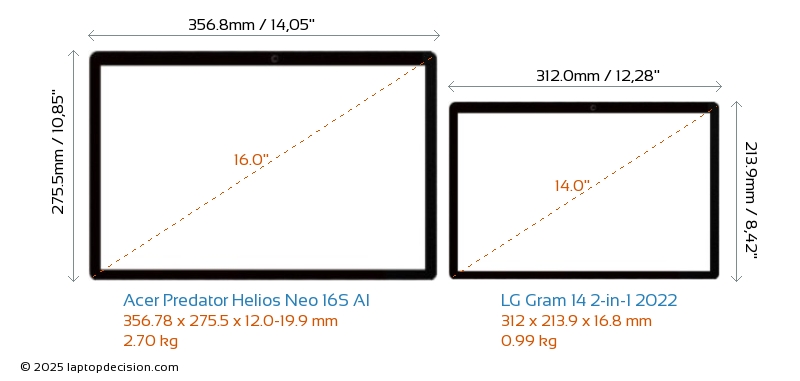 HDMIAmbos Predator Helios Neo 16S AI y Gram 14 2-in-1 2022 cuentan con un puerto HDMI. Predator Helios Neo 16S AI ofrece 1x HDMI 2.1, mientras que Gram 14 2-in-1 2022 ofrece 1x HDMI 2.0.