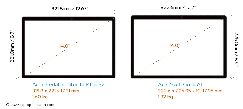 HDMI Predator Triton 14 PT14-52 cuenta con un puerto HDMI (1x HDMI 2.1) para conectar a monitores externos. Swift Go 14 AI no tiene puerto HDMI.