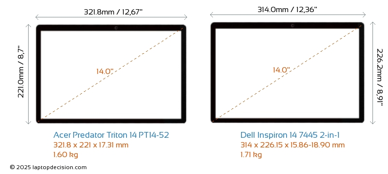 HDMIAmbos Predator Triton 14 PT14-52 y Inspiron 14 7445 2-in-1 cuentan con un puerto HDMI. Predator Triton 14 PT14-52 ofrece 1x HDMI 2.1, mientras que Inspiron 14 7445 2-in-1 ofrece 1x HDMI 1.4.