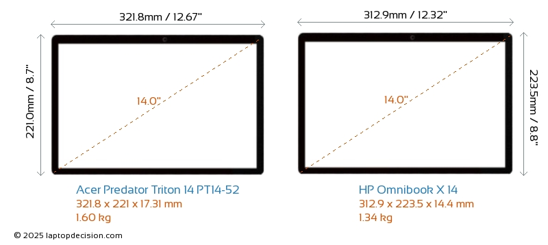 HDMI Predator Triton 14 PT14-52 cuenta con un puerto HDMI (1x HDMI 2.1) para conectar a monitores externos. Omnibook X 14 no tiene puerto HDMI.