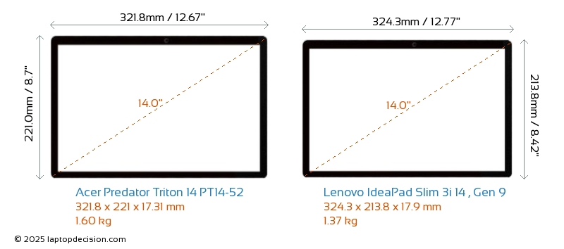 Thunderbolt Predator Triton 14 PT14-52 está equipado con un puerto Thunderbolt 4. IdeaPad Slim 3i 14 , Gen 9 no tiene puerto Thunderbolt.