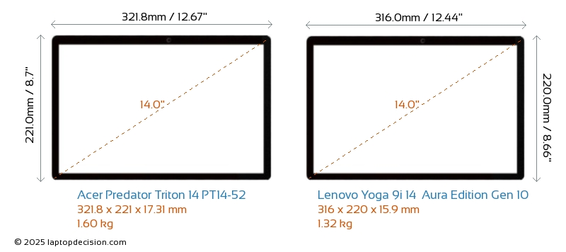 HDMI Predator Triton 14 PT14-52 cuenta con un puerto HDMI (1x HDMI 2.1) para conectar a monitores externos. Yoga 9i 14 Aura Edition Gen 10 no tiene puerto HDMI.