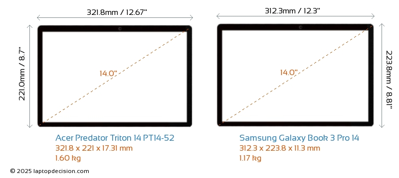 HDMIAmbos Predator Triton 14 PT14-52 y Galaxy Book 3 Pro 14 cuentan con un puerto HDMI. Predator Triton 14 PT14-52 ofrece 1x HDMI 2.1, mientras que Galaxy Book 3 Pro 14 ofrece 1x HDMI 1.4.
