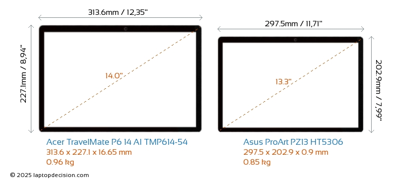 HDMI TravelMate P6 14 AI TMP614-54 cuenta con un puerto HDMI (1x HDMI 2.1) para conectar a monitores externos. ProArt PZ13 HT5306 no tiene puerto HDMI.