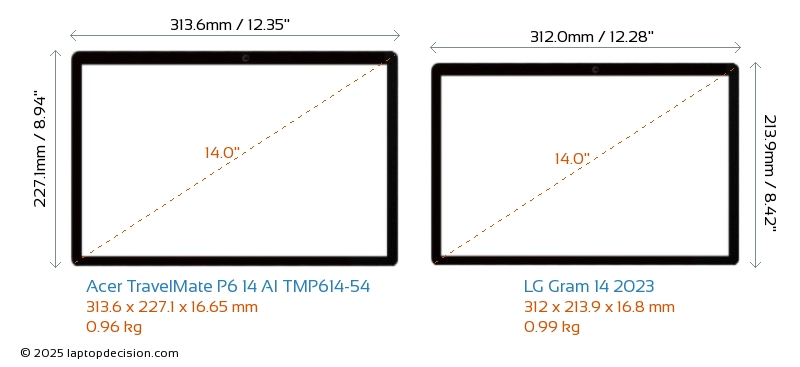 USBAmbos TravelMate P6 14 AI TMP614-54 y Gram 14 2023 cuentan con 2x USB 3.2 puertos USB-A.Ambos TravelMate P6 14 AI TMP614-54 y Gram 14 2023 cuentan con 2x USB 4.0 puertos USB Type-C.