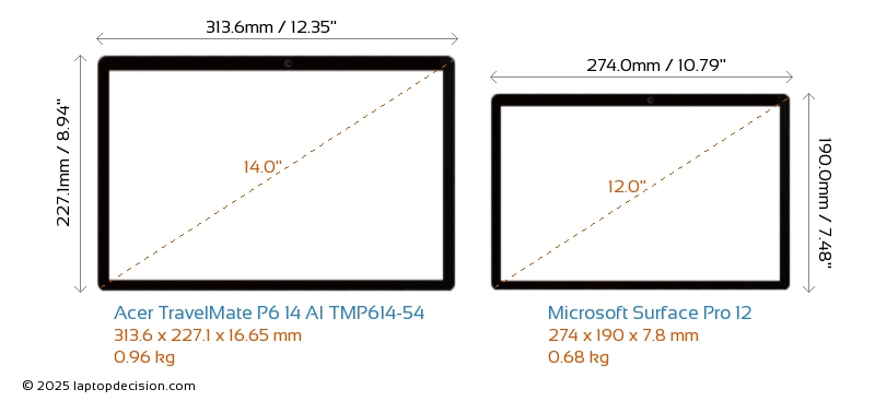HDMI TravelMate P6 14 AI TMP614-54 cuenta con un puerto HDMI (1x HDMI 2.1) para conectar a monitores externos. Surface Pro 12 no tiene puerto HDMI.
