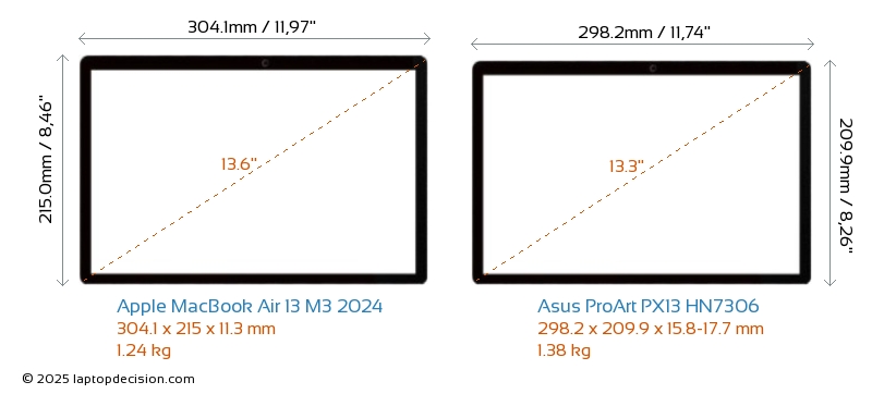 HDMI ProArt PX13 HN7306 cuenta con un puerto HDMI (1x HDMI 2.1) para conectar a monitores externos. MacBook Air 13 M3 2024 no tiene puerto HDMI.