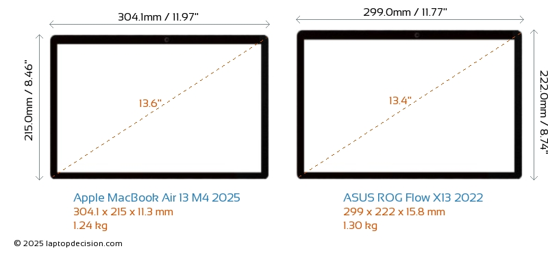 HDMI ROG Flow X13 2022 cuenta con un puerto HDMI (1x HDMI 2.0) para conectar a monitores externos. MacBook Air 13 M4 2025 no tiene puerto HDMI.