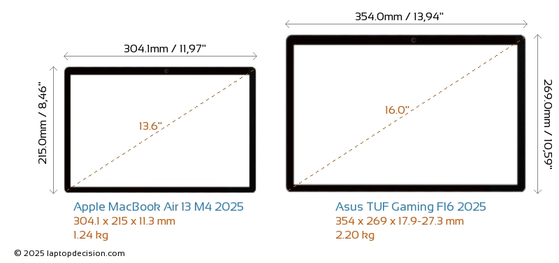 HDMI TUF Gaming F16 2025 cuenta con un puerto HDMI (1x HDMI 2.1) para conectar a monitores externos. MacBook Air 13 M4 2025 no tiene puerto HDMI.